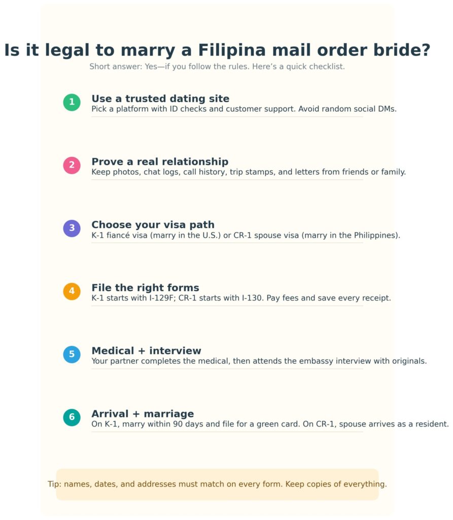 Pick your path early. K-1 fiancé visa if you plan to marry in the U.S.; CR-1 if you marry in the Philippines first. Build proof of a real relationship: photos together, boarding passes, chat logs, money wires, letters from friends or family. For K-1, file I-129F, watch notices, then your partner completes medicals and an interview at the embassy. After entry, you have 90 days to marry and then file for a green card. For CR-1, marry first, file I-130, complete the NVC steps, and your spouse enters as a permanent resident. Keep names, dates, and addresses the same across forms. Save copies of everything. Set a small monthly fund for fees and travel so costs don’t stall your plans.